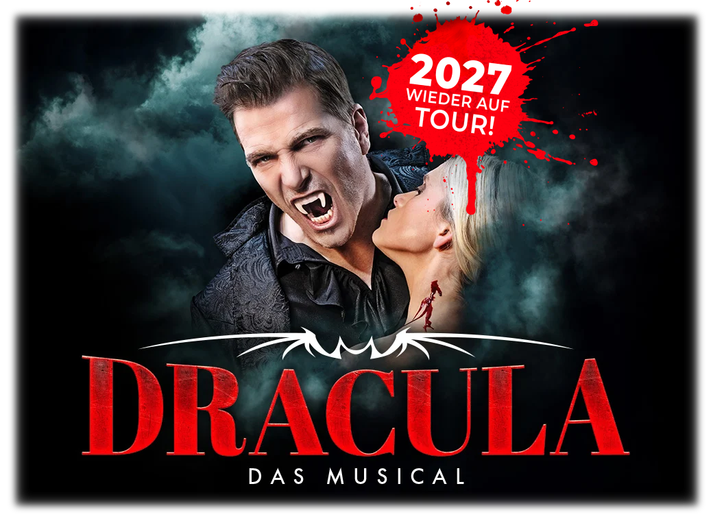 Erlebe die unsterbliche Liebesgeschichte von „Dracula” als fesselndes Musical-Erlebnis über ewige Liebe, dunkle Begierde und die Macht der Verführung: 2026 erstmals auf großer Tour durch Deutschland und Österreich und 2027 kehrt der Graf aufgrund der hohen Nachfrage zurück!